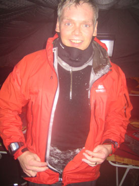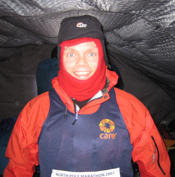 Miles changing post run Straight after the finish, changing time. The North Pole is no place to hang about in wet gear. Note the solid ice which was locked into all my clothing. Trying to change quickly into dry clothes in a tent at -5 deg C while chilling fast was not at all enjoyable, it took a while to warm up |