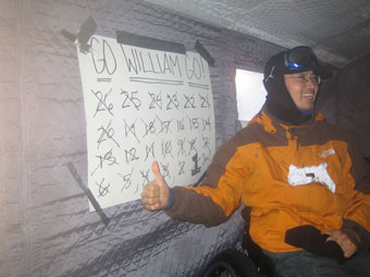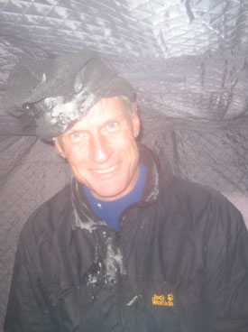A delighted Patrick Finishing in an amazing 5:35, Patrick was beaming. He ran without snowshoes from lap 5 onwards, finding it much easier, but was still had back pain for much of the way and took pain killers. His balaclava is frozen solid from perspiration and water in his breath. |