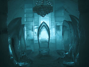 Icehotel - a cool place Ice chairs and ice chandelier in the entrance lobby |