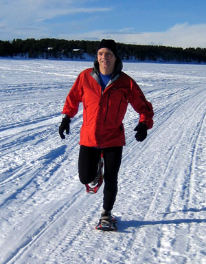 After a post-arrival late lunch, I leave Sarah checking out the ice sculptures and sauna, and head for a steady six mile snowshoe run. The lake is iced over and covered with snow, and the snowmobile tracks give a good surface to run on. The temperature is just below zero, and has been unseasonably warm for the last week. Navigation is easy on the wide, flat lake and I find I am running at about 10 min/mile, or +/- 15% quicker than the hilly terrain in Oslo.
